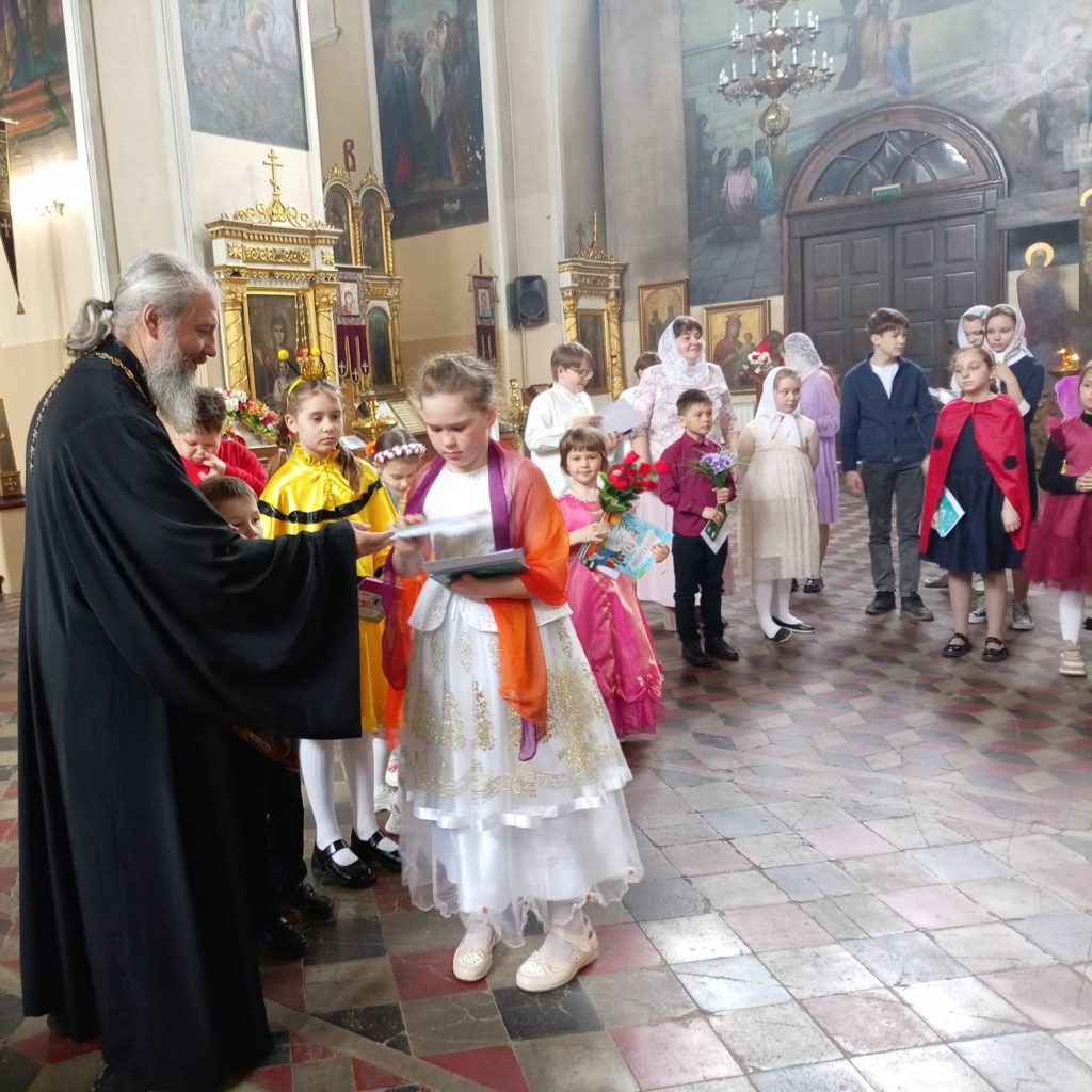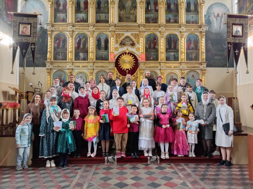 В завершение встречи настоятель собора и директор воскресной школы Елена Валентиновна Митина вручили воспитанникам дипломы и подарки за участие в благочиннических конкурсах «Пасхальная радость» и «Хвалите имя Господне».