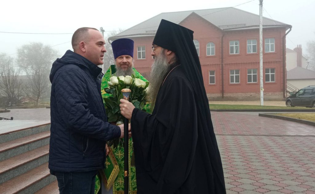 Перед храмом епископа Иннокентия встретили благочинный Николаевского округа, настоятель собора протоиерей Владимир Растопшин и глава Пугачёвского муниципального района Алексей Владиславович Янин. Приветствуя гостя, они вручили ему цветы.
