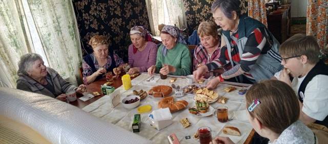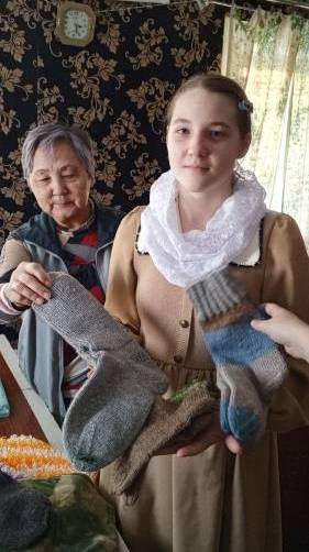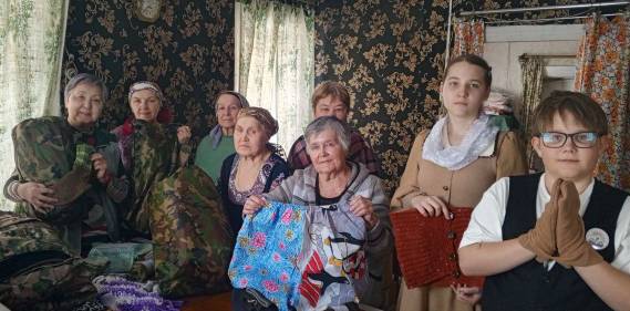 Женщины были очень растроганы вниманием и пригласили гостей продолжить общение за столом, накрытым для чаепития, а в завершение встречи показали, какие изделия изготавливают в этом оборудованном под цех домике. Это антитепловизорные (антидроновые) покрывала, нижнее бельё, тёплые носки, сухой душ и другое.