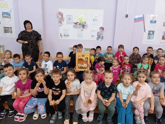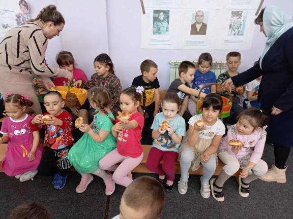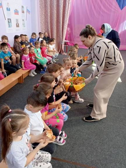 После беседы Валентина Викторовна и воспитатели детсада раздали ребятам аппетитные румяные булочки, с любовью приготовленные взрослыми.